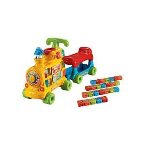 All aboard! This versatile train is also a teaching tool. Introduce baby to numbers, letters, colors, songs, stories, and more through two learning modes-walker mode and discovery mode. The adaptable train can be used alone for floor play, pushed along as a walker, or the child can ride on the train. VTech. Ages: 12 mos.+